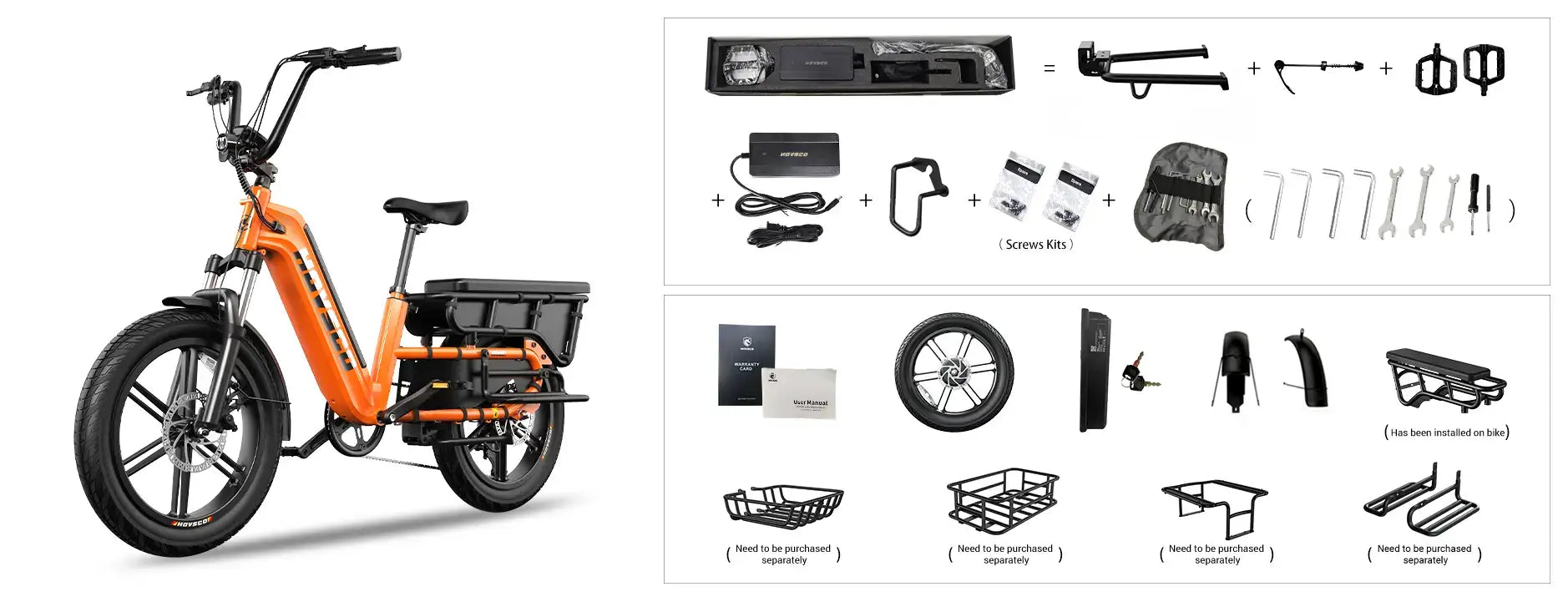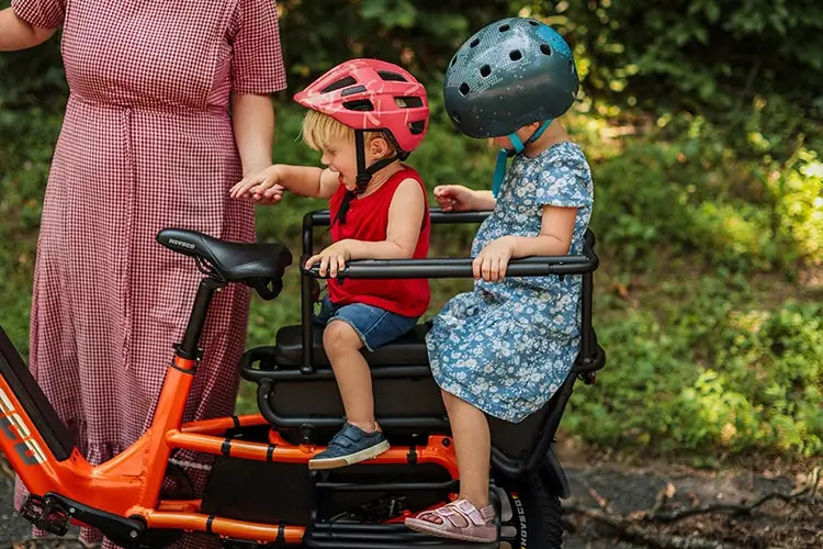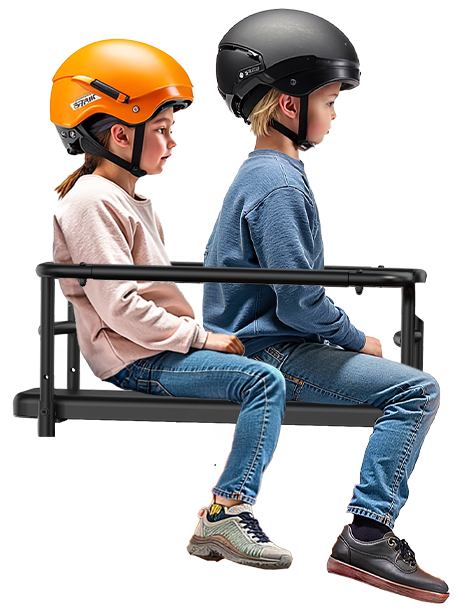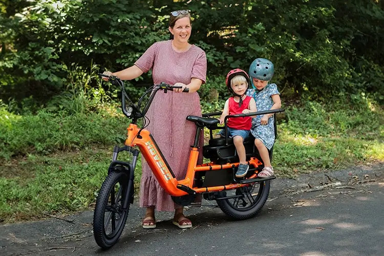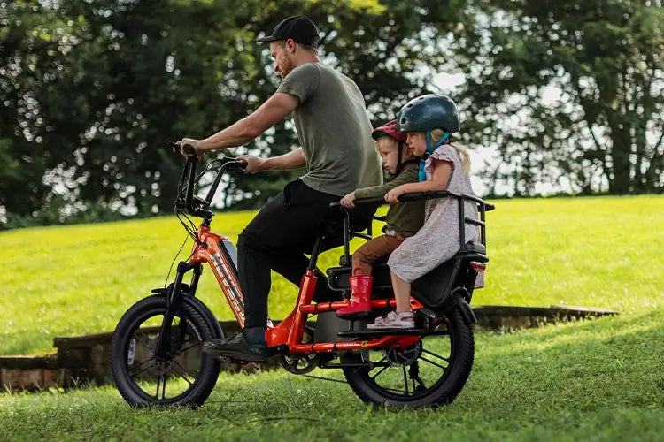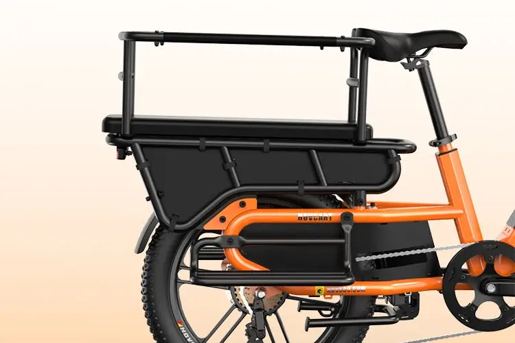 We're committed to building safe and reliable bikes. The HOVCART features a durable 6061 aluminum alloy frame, a high-quality suspension fork, and hydraulic brakes for strong stopping power on both wet and dry roads.HovCart has an IPX5 waterproof rating, so it's not afraid of rainy days, and the spacious shelves allow parents to easily take two children to enjoy outdoor time.You could also carry an adult on rear rack. With its powerful electric motor and sturdy cargo area, this bike is capable of carrying up to two children comfortably and safely. Whether you're running errands or exploring the outdoors, the electric cargo bike makes family time more enjoyable than ever.