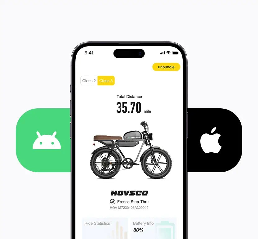 Stay connected with the HovGtrs mobile app, available on iOS and Android, to track speed, battery life, mileage, and more. With advanced safety features including 180mm hydraulic disc brakes, front and rear lights, and turn signals, you can ride confidently day or night.