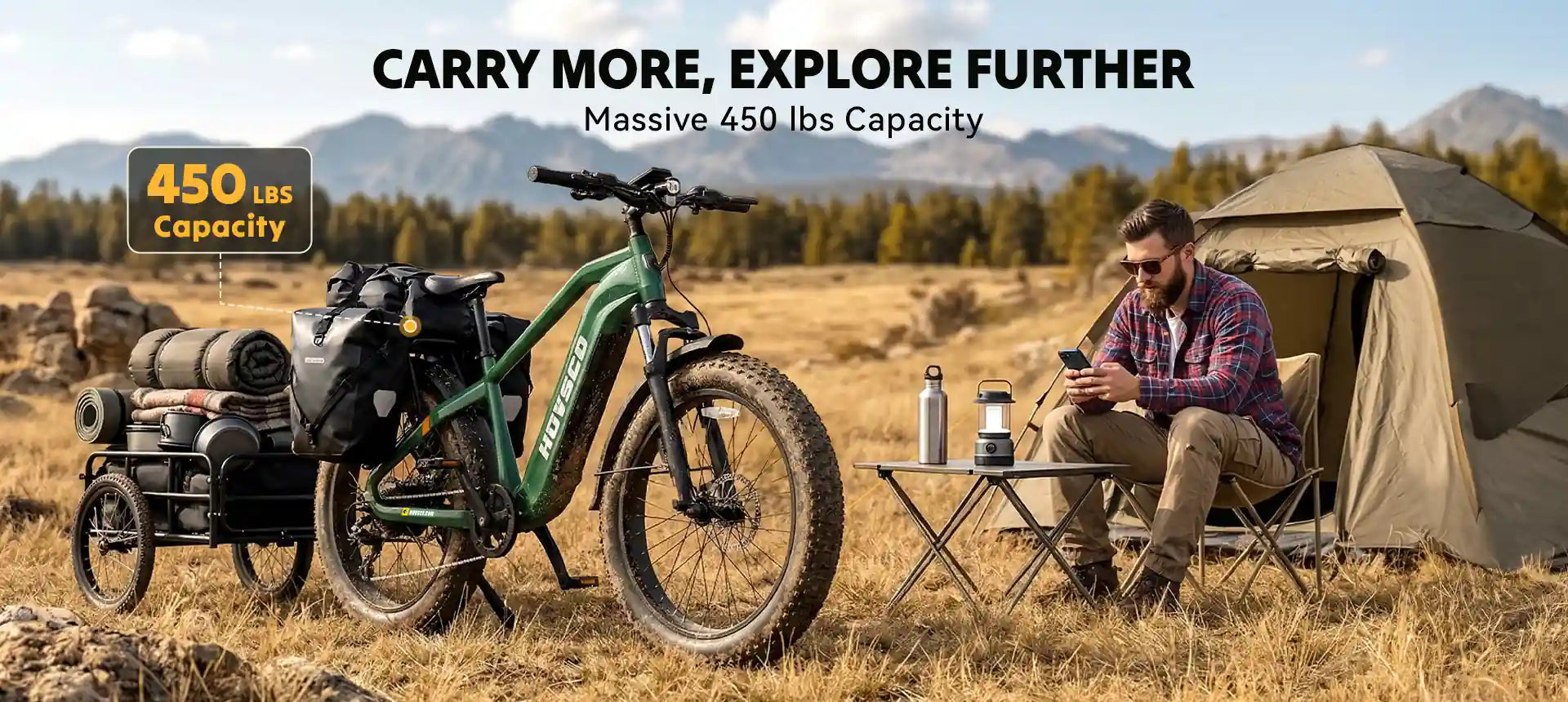 450 lbs Capacity. Pack your camping essentials or your latest catch. The HovAlpha’s rugged build delivers the stability of a cargo bike with the soul of an explorer. Carry more, explore further.