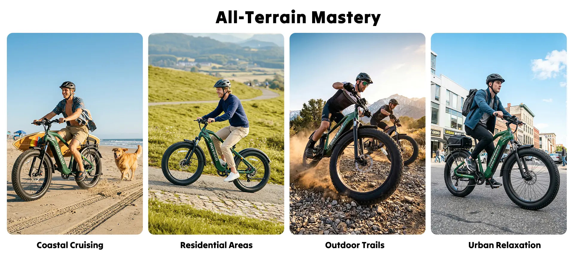 Our waterproof electric fat tire bike is the perfect ride for conquering any terrain with ease. Whether you're traversing rugged mountain trails, sandy beaches, or snow-covered roads, this bike has got you covered. With its extra-wide tires and powerful motor, it delivers the perfect balance of stability and agility, providing you with a smooth and comfortable ride no matter where you go.