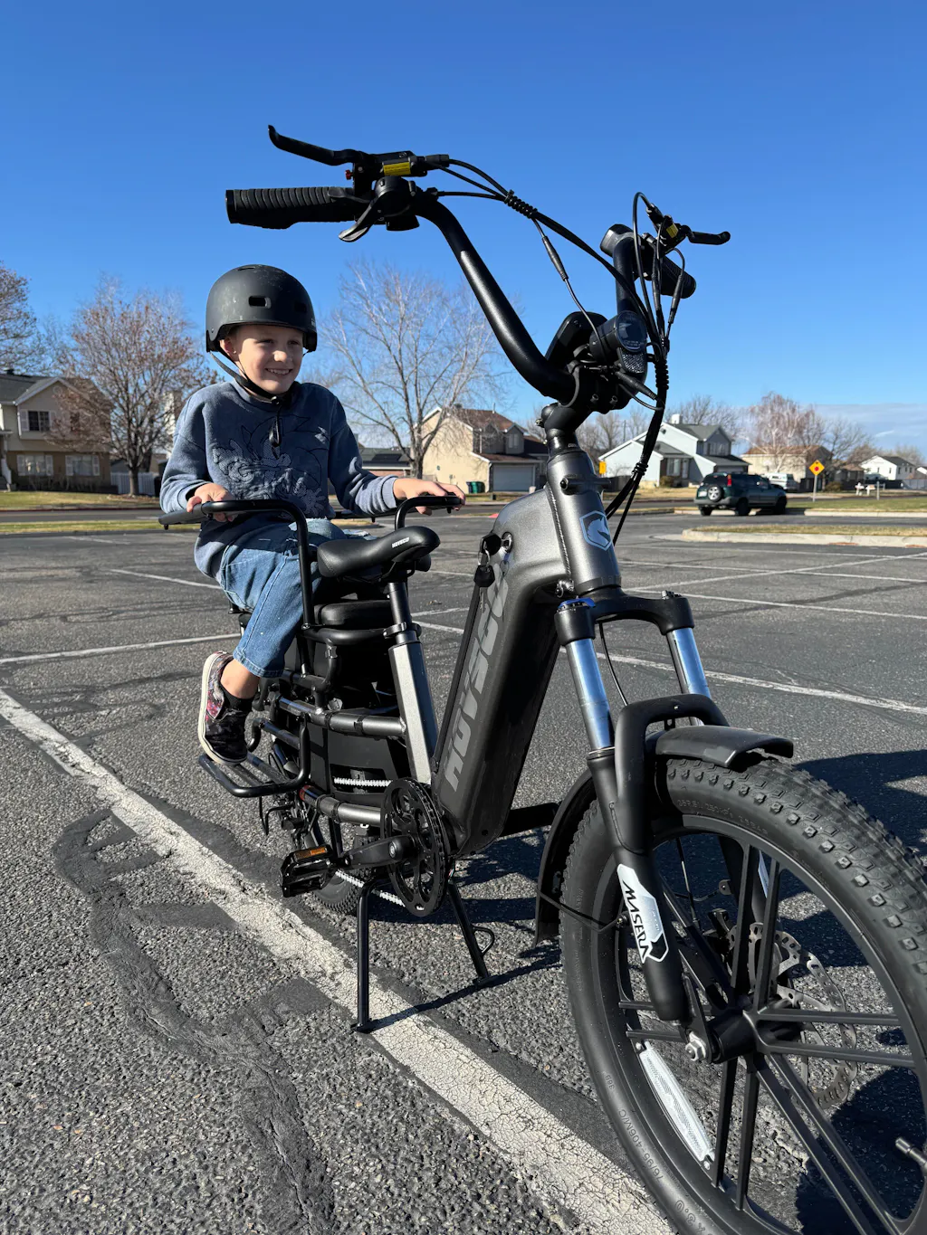 We're committed to building safe and reliable bikes. The HOVCART features a durable 6061 aluminum alloy frame, a high-quality suspension fork, and hydraulic brakes for strong stopping power on both wet and dry roads.HovCart has an IPX4 waterproof rating, so it's not afraid of rainy days, and the spacious shelves allow parents to easily take two children to enjoy outdoor time.You could also carry an adult on rear rack. With its powerful electric motor and sturdy cargo area, this bike is capable of carrying up to two children comfortably and safely. Whether you're running errands or exploring the outdoors, this family ebike makes every outing more enjoyable than ever.