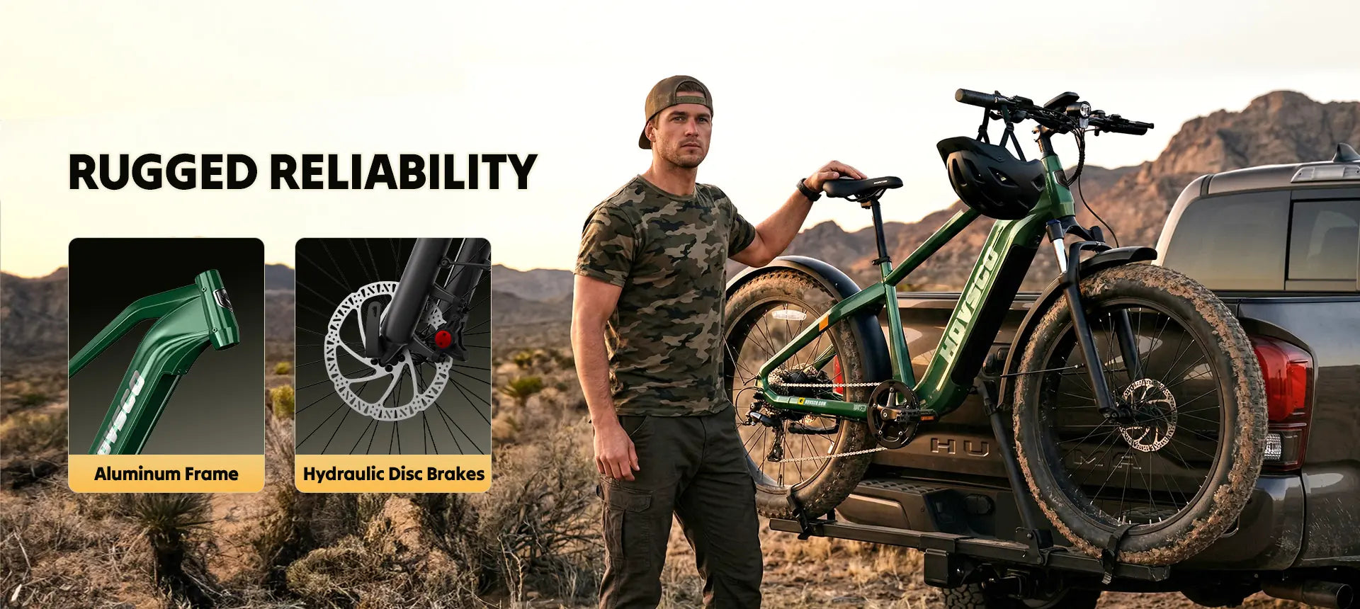 450 lbs Capacity. Pack your camping essentials or your latest catch. The HovAlpha’s rugged build delivers the stability of a cargo bike with the soul of an explorer. Carry more, explore further.
